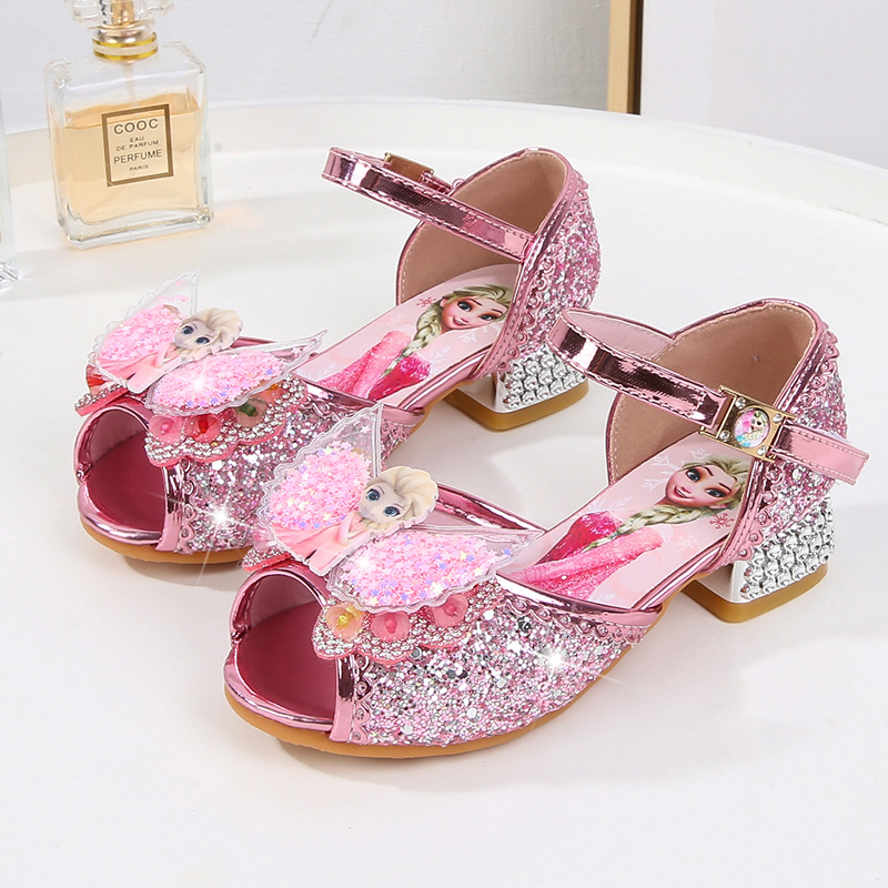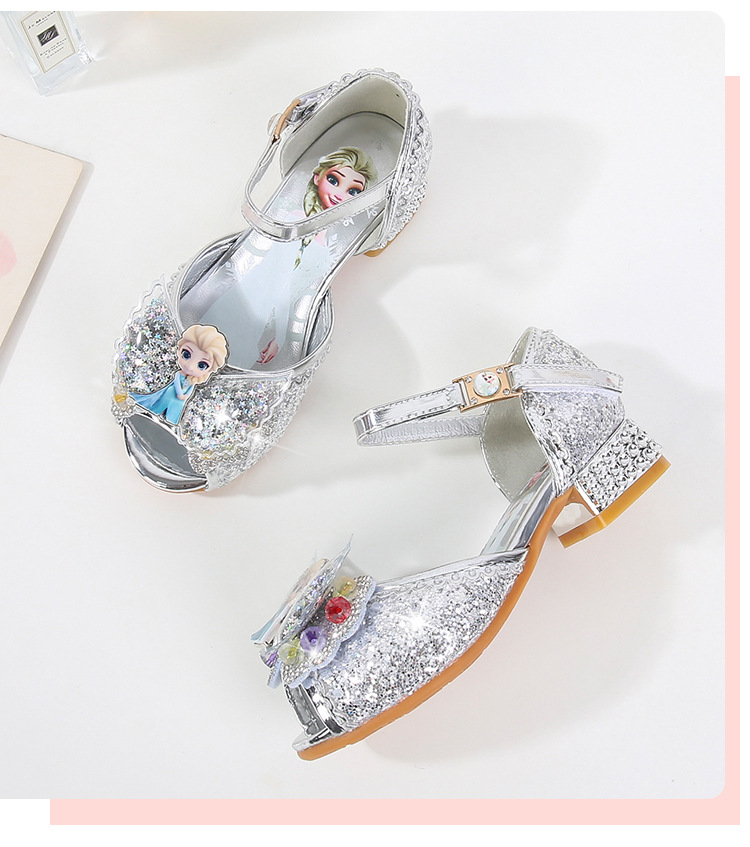Giày Công chúa Elsa hở mũi cao gót cho bé gái được thiết kế nơ hình Elsa với đôi cánh thiên thần, lòng giày có hình elsa với da pu mềm mại, cực kỳ êm chân cho bé. Với gót vuông cao 2,5cm giúp bé dễ dàng thoải mái vui chơi.