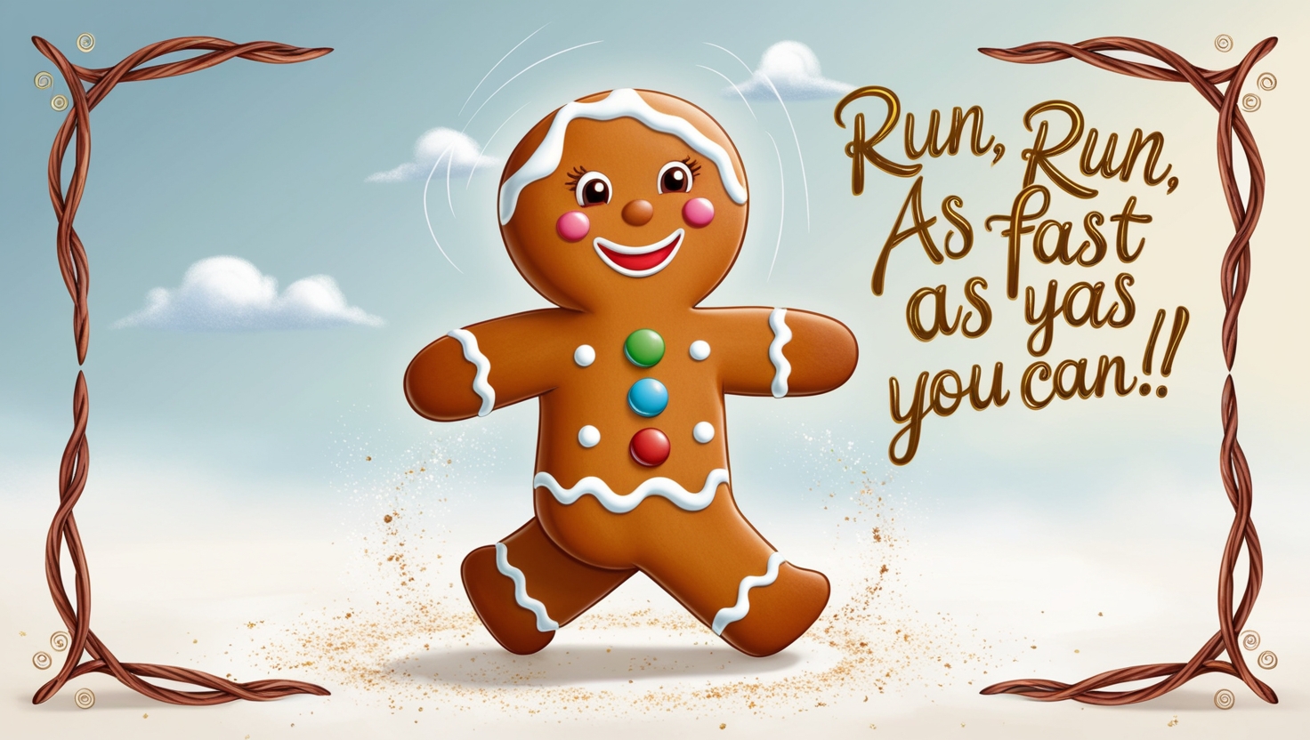 Ngày xửa ngày xưa có một ông già, một bà già và một cậu bé. Một buổi sáng, bà già làm một ít bánh gừng hình một người cậu bé. Bà thêm băng cho tóc và quần áo của anh ta, và những đốm bột nhỏ cho mũi và mắt của anh ta. Khi cô đặt anh ta vào lò nướng để nướng, cô nói với cậu bé, "Bạn hãy xem người cậu bé bánh gừng trong khi ông của bạn và tôi đi làm việc trong vườn". Vì vậy, ông già và bà già đi ra ngoài và bắt đầu đào khoai tây, và để cậu bé chăm sóc lò nướng. Nhưng cậu bắt đầu mơ mộng ban ngày, và không xem nó mọi lúc. Đột nhiên, cậu nghe thấy một tiếng động, và cậu nhìn lên và cửa lò bật mở, và một người cậu bé bánh gừng nhảy ra khỏi lò, và lăn lộn từ đầu đến cuối về phía cánh cửa đang mở của ngôi nhà. Cậu bé chạy đến đóng cửa lại, nhưng người cậu bé bánh gừng quá nhanh đối với cậu và lăn qua cửa, xuống các bậc thang, và ra đường rất lâu trước khi cậu bé có thể bắt được cậu. Cậu bé chạy theo cậu nhanh nhất có thể, kêu lên với ông và bà của mình, những người đã nghe thấy tiếng động, và ném thuổng của họ xuống vườn để đuổi theo. Người cậu bé bánh gừng đi xa hơn cả ba người một quãng đường dài, và sớm khuất tầm nhìn, trong khi họ phải ngồi xuống, hết hơi, trên bờ để nghỉ ngơi. Người cậu bé bánh gừng đi tiếp, và dần dần anh ta đến gặp hai người cậu bé đang đào một cái giếng, những người nhìn lên từ công việc của họ và gọi, "Anh đi đâu vậy, người bánh gừng?" Anh ta nói, "Tôi đã chạy nhanh hơn một ông già, một bà già và một cậu bé - và tôi cũng có thể chạy nhanh hơn anh-o-o!" "" Bạn có thể, bạn có thể? Chúng ta sẽ xem về điều đó? "Họ nói, và vì vậy họ ném cuốc xuống và chạy theo anh ta, nhưng không thể bắt kịp anh ta, và ngay sau đó họ phải ngồi xuống bên vệ đường để nghỉ ngơi. Người cậu bé chạy bánh gừng, và anh ta đào hai người cậu bé. "Anh đi đâu vậy, anh chàng bánh gừng?" họ nói. Anh ta nói, "Tôi đã chạy nhanh hơn một ông già, một bà già, một cậu bé và hai người đào giếng, và tôi cũng có thể chạy nhanh hơn anh-o-o!"
