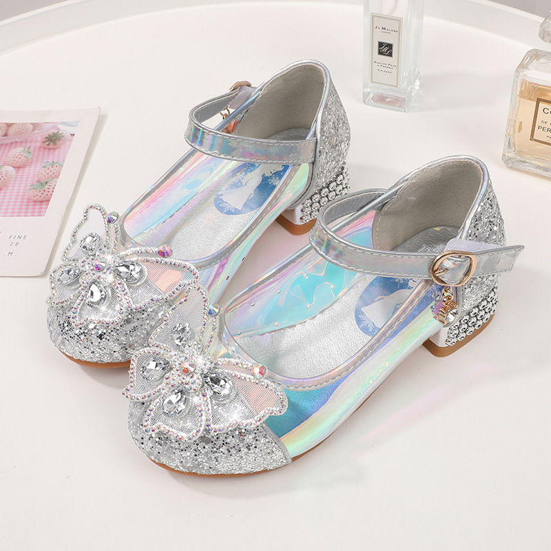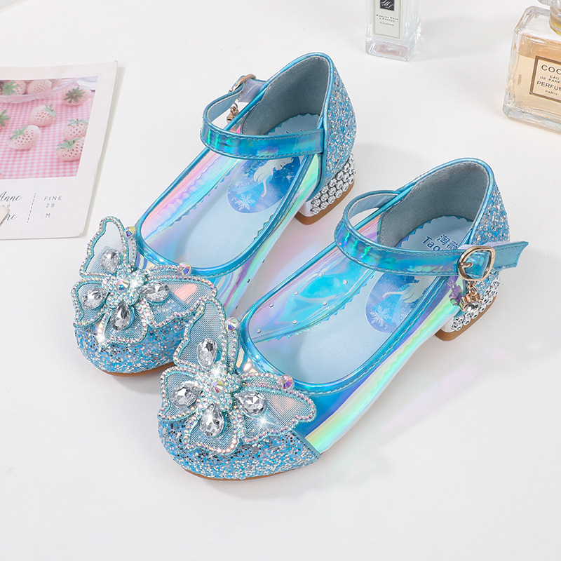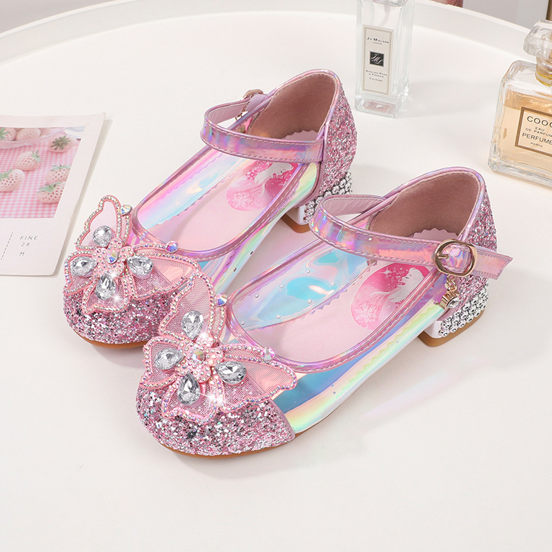Sản Phẩm: giày công chúa cho bé gái Elsa cao gót đính hình nơ bướm xinh xắn, thiết kế kiểu dáng búp bê, khóa dán cho bé dễ thao tác, giầy búp bê cho bé gái đi học, đi chơi đều rất phù hợp với gót vuông 2.5cm bé dễ dàng đi lại thoải mái.